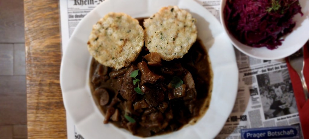 und einmal haben wir – ich hoffe ich schreibe es richtig – Svíčková s knedlikem, das Nationalgericht Tschechiens, bestellt: Böhmischer Sauerbraten vom Rind mit Wurzelgemüserahmsauce und frischem Zitronenthymian. Serviert wurde das Fleisch mit zwei Knödeln, Sahne und einer orangenen Sauce mit Preiselbeeren. Ich war überrascht von der süßlichen, orangenen Soße. Uns wurde es so erklärt: Der Rinderbraten wird zunächst in eine Marinade aus Wasser, Essig, Zwiebeln, Gewürznelke und verschiedenem Wurzelgemüse und Pfefferkörnern eingelegt. Durch das passierte Wurzelgemüse, vornehmlich die Karotte, erhält die Sauce einen leicht süßlichen Geschmack.