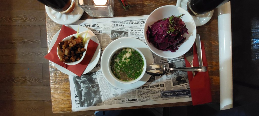 Gestartet haben wir mit zwei Vorspeisen-Suppen, einmal die Rinderbrühen-Suppe, die ihr auf dem Foto seht, und einer Kastenien-Suppe, die es zur vorweihnachtlichen Zeit saisonal auf der Karte gab. Dazu hatten wir uns auch noch einen Zelný salát (Rotkrautsalat) bestellt (5,50 Euro). Die Suppen haben uns geschmeckt, aber besonders der leckere Salat ist herausgestochen, der sah nicht nur wunderschön drapiert aus, sondern schmeckt auch fantastisch.