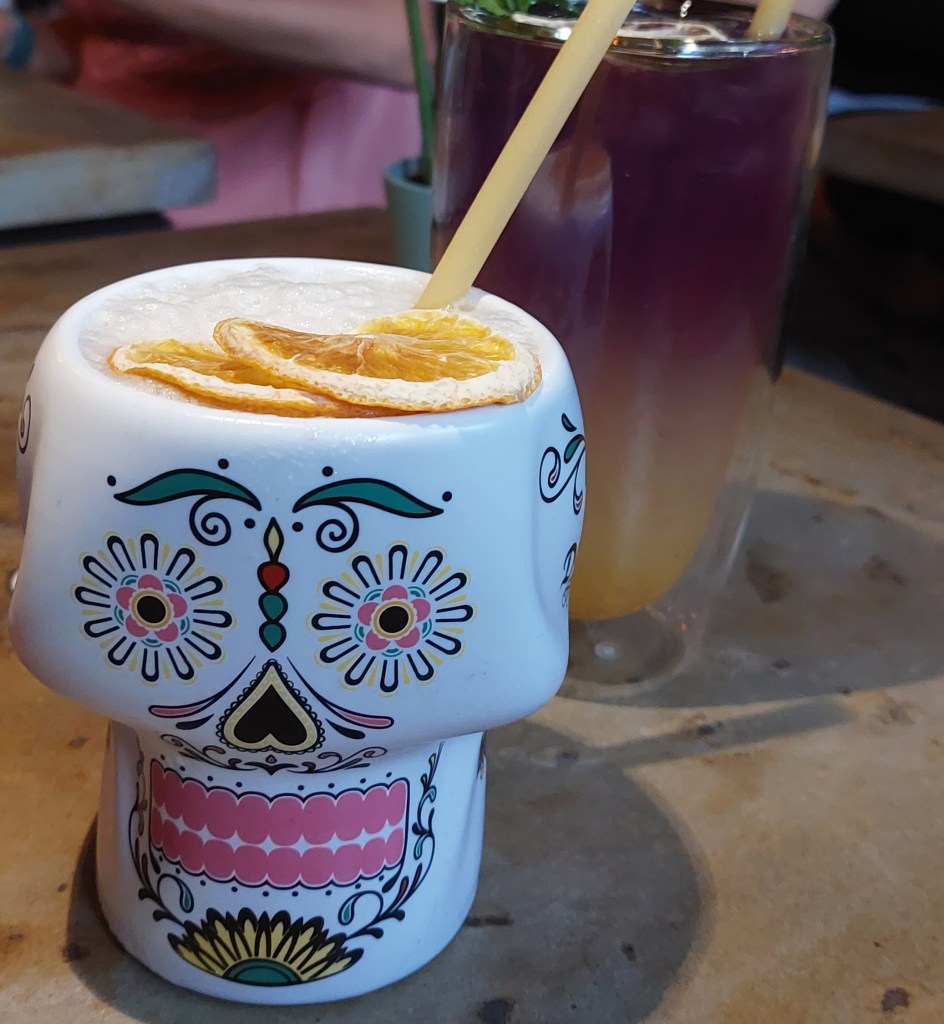 Meine Begleitung bestellte einen homemade Peapina Icetea, einen Pfirsich-Ananas Cold Brew Tee, der in einem bunten Totenkopf-Glas geliefert wurde. Beide Eistees waren lecker und es war schön, dass es so eine große Auswahl an nicht-alkoholischen bunten Getränken gab.