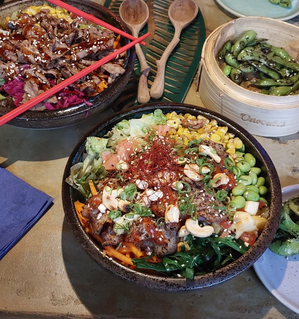 Bei Onocubes gibt es Fusion Asian Cuisine und jede Menge Bowls. Das Besondere: Es gibt auch ein sehr großes veganes Angebot, so gibt es beispielsweise unter den Vorspeisen: Das Rote Meer , eine rote Misosuppe mit Granatapfel Geschmack, gegrilltem Bio Tofu & Rosa Gari (8,50 Euro), Die Golden Globes, Kichererbsenbällchen gefüllt mit Sesam-Tropical Salsa & Minze (8,50 Euro) oder Burn Baby Burn, gegrillte junge Sojabohnen aus Japan mit geröstetem Sesam und Fleur De Sel (5,90 Euro), die man auch als Edamame kennt. Wir haben einmal die Burn Baby Burn Bohnen als Vorspeise bestellt, die in einem Bambus-Körbchen mit dem Namen des Restaurants, serviert hat, siehe Foto unten. Dazu haben wir zwei Bowls bestellt.