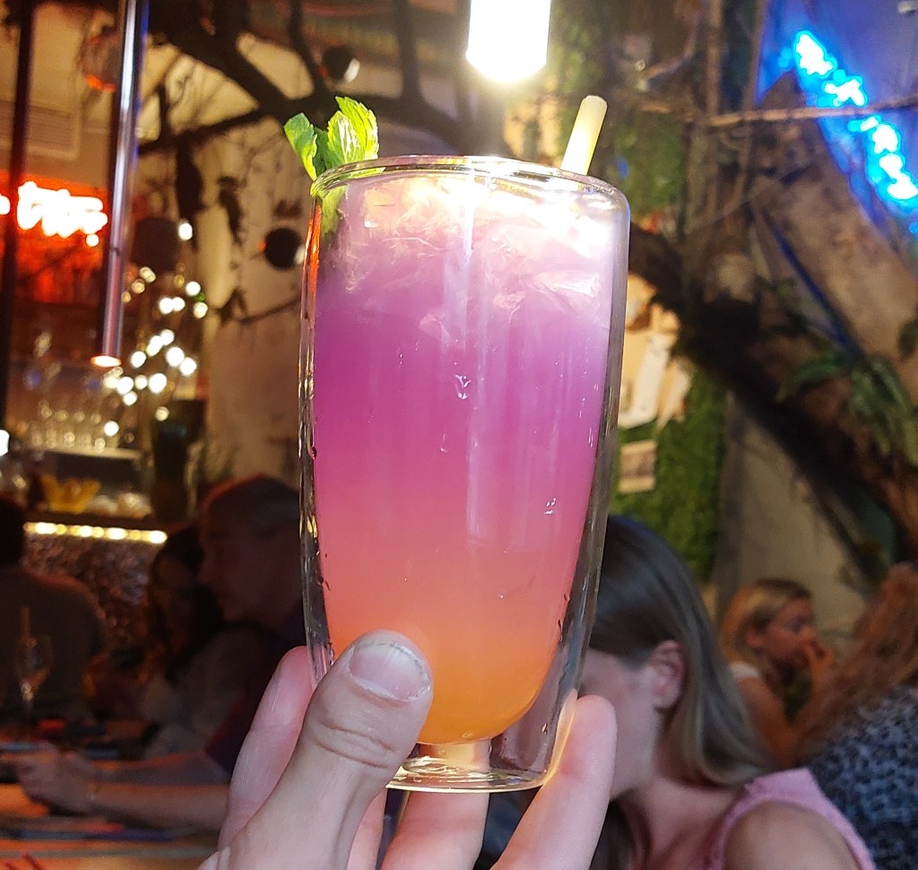 Vorab: Ich würde euch auf jeden Fall empfehlen vorab zu reservieren, wenn ihr ins Onocubes wollt, denn das Restaurant ist nicht besonders groß, weshalb eine Reservierung empfehlnswert ist. Innen ist es super flashy eingerichtet, mit bunten Lichtern, Moos an den Wänden, und einem kargen Baum in der Mitte, von dem Dekoartikel herunterhängen. Wenn ihr ein wenig runter scrollt, könnt ihr die Inneneinrichtung im Hintergrund auf dem Foto mit meinem Drink sehen.