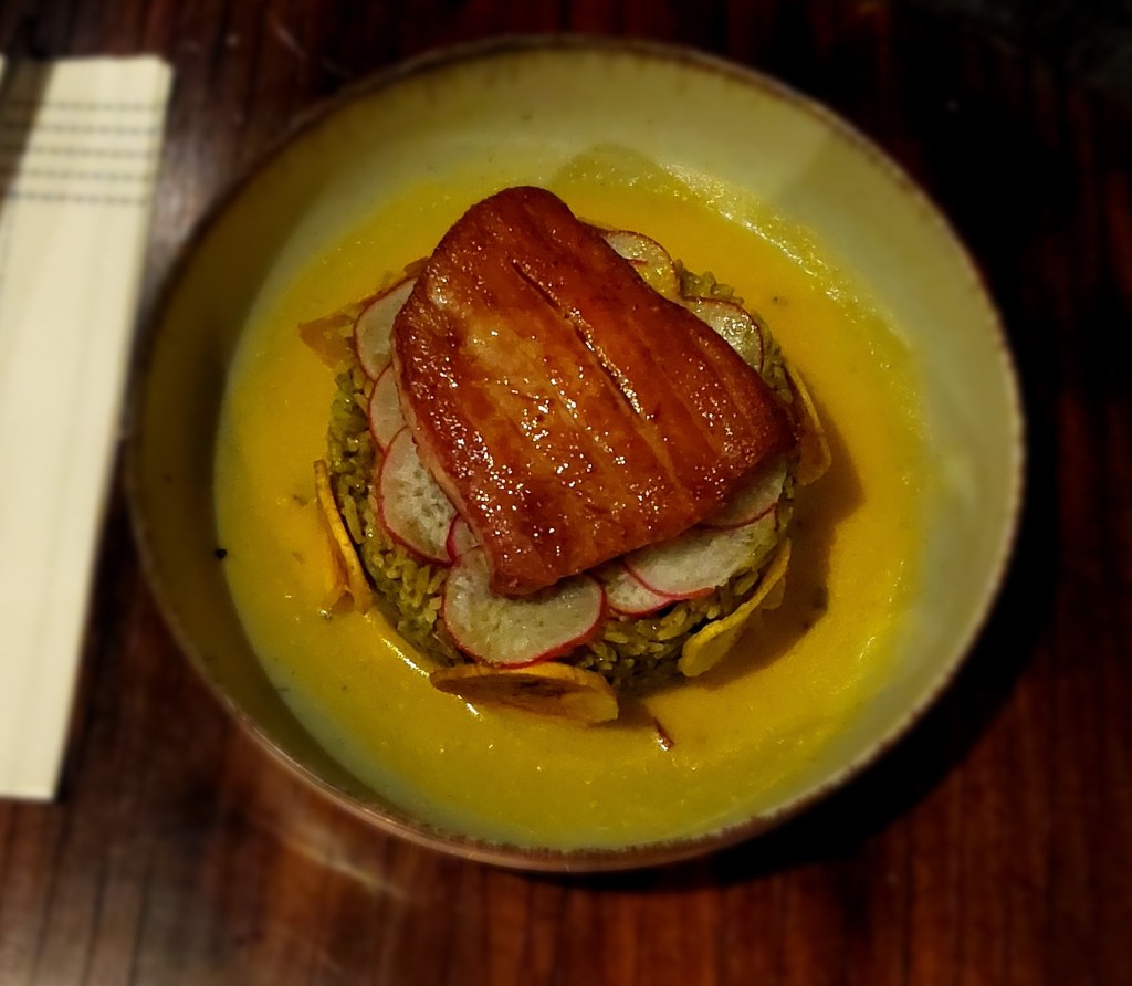 Weiter geht es zur Hauptspeise: Da wir schon bei den Vorspeisen Fisch gegessen haben, wollte ich bei Fisch bleiben. Bestellt habe ich daher das Arroz Verde von Lomito de Atún (21 Euro), gebratener Thunfisch mit grünem Reis aus Koriander und Spinat, Mais, Paprika und Salsa Criolla (Sauce aus Zwiebeln, Chili, Koriander, Limettensaft) in gelber Leche de Tigre. Wenn ich mich recht entsinne, ist Letzteres eine Mischung aus Limette, Ingwer, Zwiebeln und Chili. Drapiert wurde das Gericht mit weiteren Bananenchips, aber seht selbst: